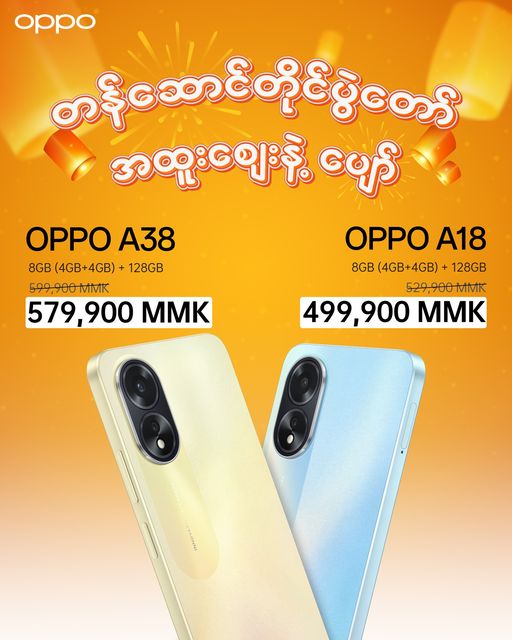 OPPO A38 ရဲ့ 8GB (4GB+4GB) RAM + 128GB ROM ကို တန်ဆောင်တိုင်အထူးဈေး 579,900 ကျပ်